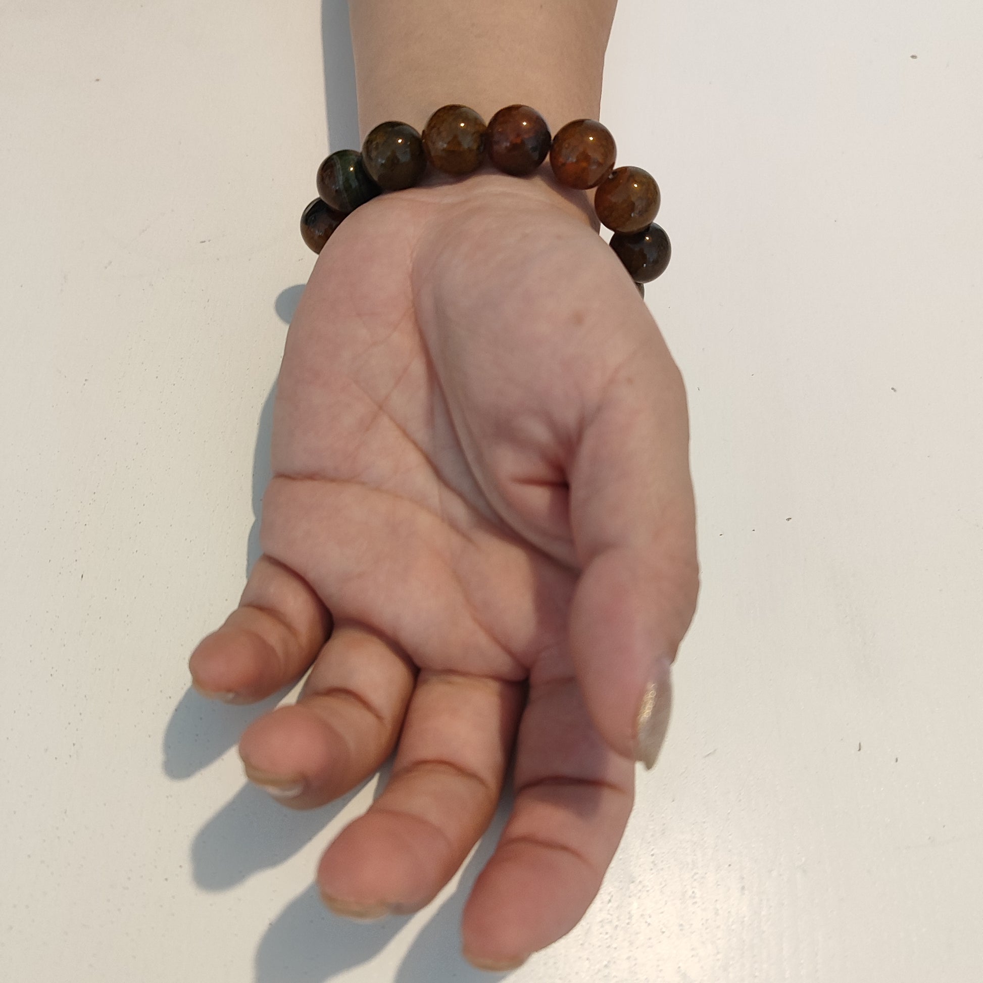 Beau bracelet en pierre naturelle de Jade couleur orange-vert marbré taille perle 10mm.